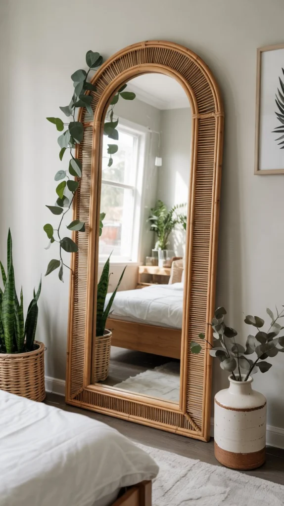 For spring, try pairing a rattan or natural wood-framed arch mirror with a handful of trailing photos or a eucalyptus stem tucked beside it. The organic shapes play off each other beautifully, and the reflection bounces that soft green energy around the whole room. You don’t need a big space for this – even a narrow bedroom corner becomes a styled vignette.