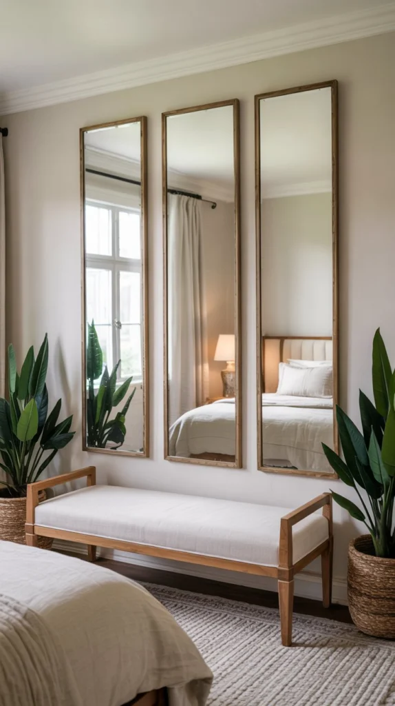 A triptych – three vertical panels hung close together – brings a structured, architectural quality to a bedroom wall. It’s the kind of mirror arrangement that looks like it belongs in a carefully designed boutique hotel, but it’s surprisingly achievable in any home.