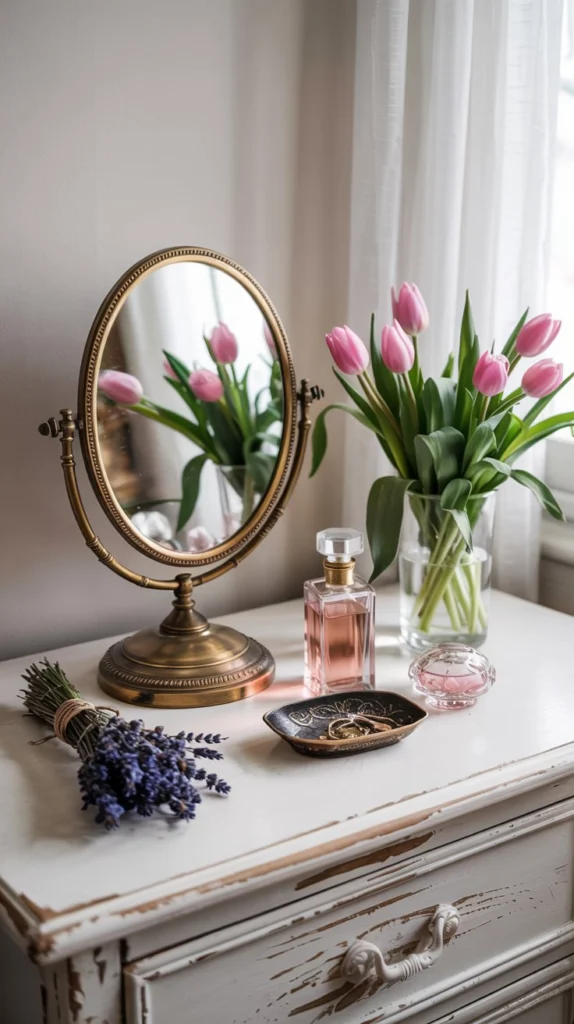 There’s something deeply romantic about a vintage-style vanity mirror sitting on a dresser top – especially when it’s styled with soft spring details. A hinged tri-fold mirror or a single oval vanity mirror with an adjustable stand creates a dedicated grooming nook that feels intentional and beautiful, not just utilitarian.