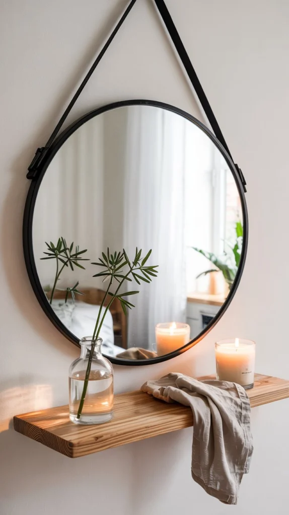 A mirror with a built-in shelf is the kind of dual-purpose decor that makes a bedroom feel designed rather than decorated. The shelf sits just below the mirror’s reflective surface and gives you a small, curated display space – a candle, a plant cutting in water, a tiny stack of books.