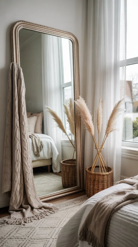 Lean it in the corner beside your window so it captures the natural light and reflects it deeper into the room. Tuck a linen throw or a rattan basket beside the base, and suddenly that corner looks like a page from an interior design magazine. This is especially impactful in smaller bedrooms and studio apartments where every square foot needs to work harder.
