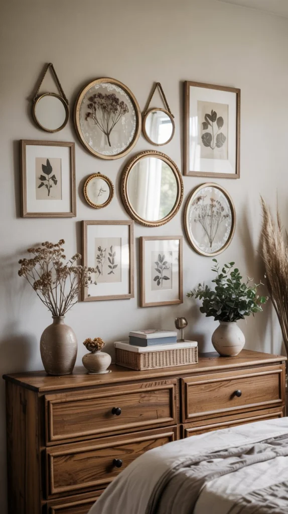 Stick to a cohesive color story: think terracotta frames alongside pressed fern prints, or white and cream pieces accented with sage green. The mirrors add sparkle and lightness to what could otherwise feel like a heavy wall arrangement.