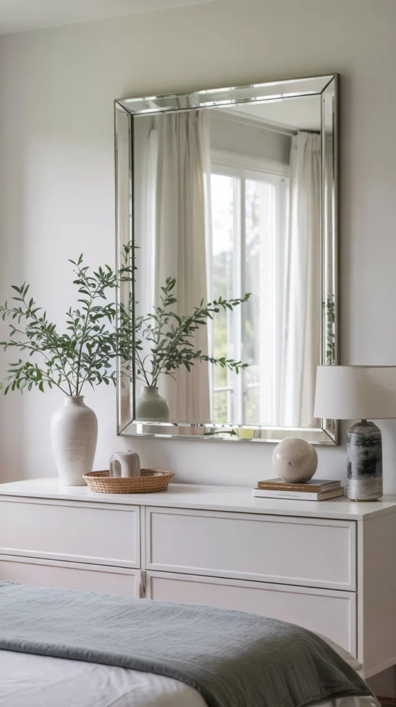 Sometimes the most impactful move is restraint. A clean, frameless mirror – whether rectangular or with softly beveled edges – disappears into the wall and lets everything around it shine. For spring 2026, this look pairs beautifully with a quiet, minimal bedroom palette: warm whites, soft grays, and the occasional dusty sage accent.