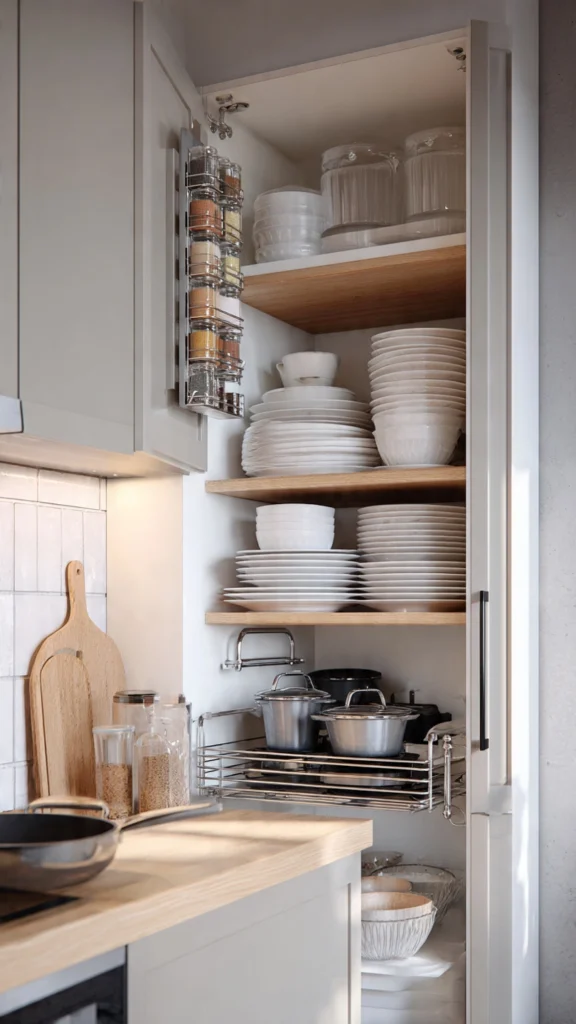 Install stackable shelf risers to create two levels where you previously had one—suddenly you can store plates on the bottom tier and bowls on top without stacking them precariously. Use under-shelf baskets that hang from existing shelves to capture wasted space. Add pull-out organizers for pots and pans that eliminate the need to unstack everything to reach the one pan at the bottom.