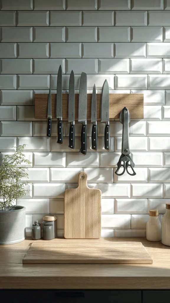 Drawer space is precious in small apartment kitchens, so get your knives and utensils off the counter and out of drawers entirely. Magnetic knife strips mounted on your wall or backsplash keep knives organized, accessible, and safely stored while freeing up entire drawers for other items.
