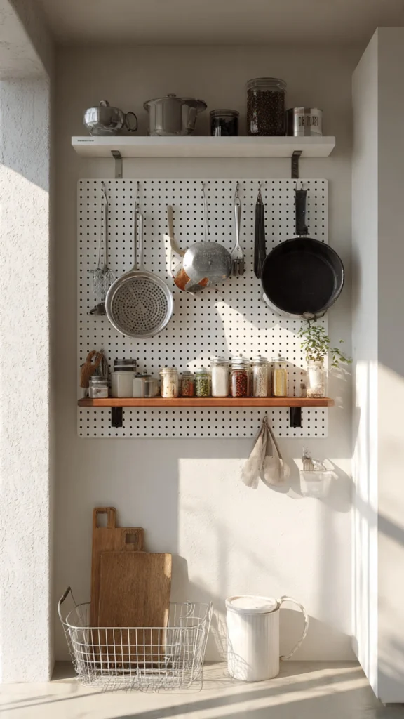Pegboards bring workshop organization into your tiny apartment kitchen with style. These perforated panels mount on any empty wall, creating customizable storage that adapts as your needs change. Rearrange hooks, shelves, and baskets whenever you want without new hardware or wall damage.