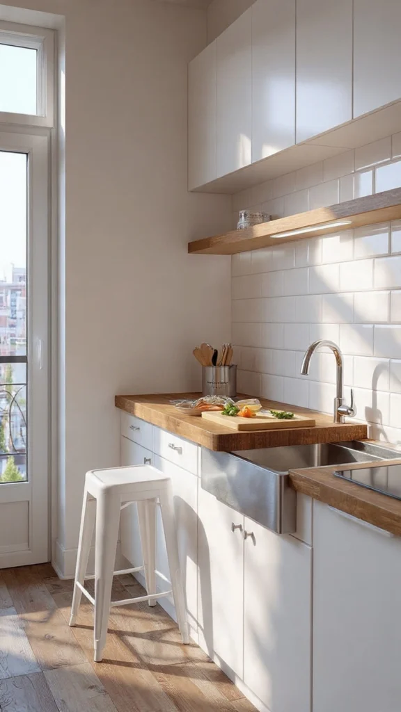 Every surface must multi-task in tiny kitchen ideas for small apartments. Over-the-sink cutting boards and colanders rest securely across your sink basin, creating instant prep space that doesn’t exist otherwise. These tools essentially give you extra counter space by using three-dimensional space more cleverly.