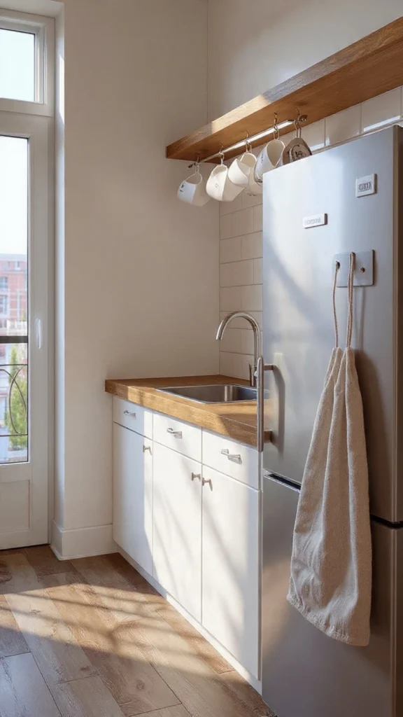 Tiny kitchens need storage solutions that don’t consume floor or counter space. Adhesive hooks, command hooks, and decorative wall hooks create vertical hanging storage throughout your kitchen without requiring permanent installation—perfect for renters who can’t drill holes everywhere.