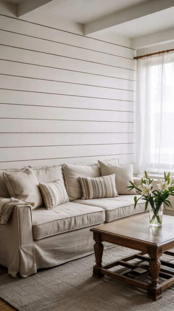 Shiplap works beautifully behind your sofa or as a fireplace surround. The horizontal lines create visual width, making smaller living rooms feel more spacious. You can install real wood planks if you own your home, or opt for peel-and-stick shiplap wallpaper that’s perfect for renters.