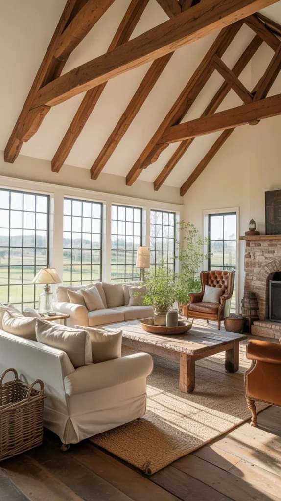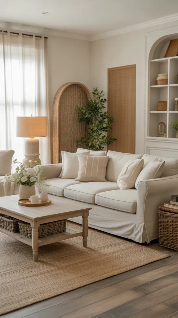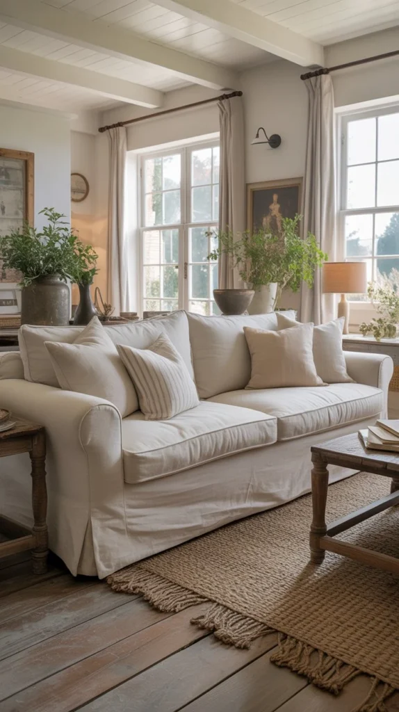 Invest in slipcovered sofas and chairs that combine style with practicality. Washable slipcovers in white, cream, or natural linen epitomize farmhouse style while being incredibly functional for real life. They create that relaxed, “please sit down” vibe that makes living rooms actually livable.