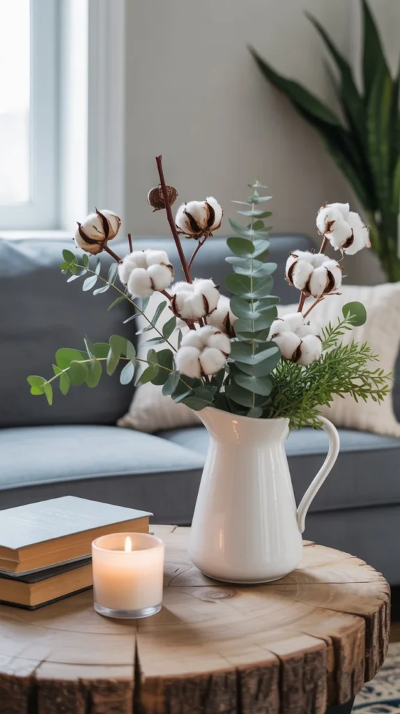 Bring life into your living room with fresh greenery and simple floral arrangements. Eucalyptus stems in a vintage pitcher, cotton stems in a ceramic vase, or a small potted fiddle leaf fig all add organic beauty. Fresh flowers don’t have to be expensive—grocery store blooms in mason jars look perfectly charming.