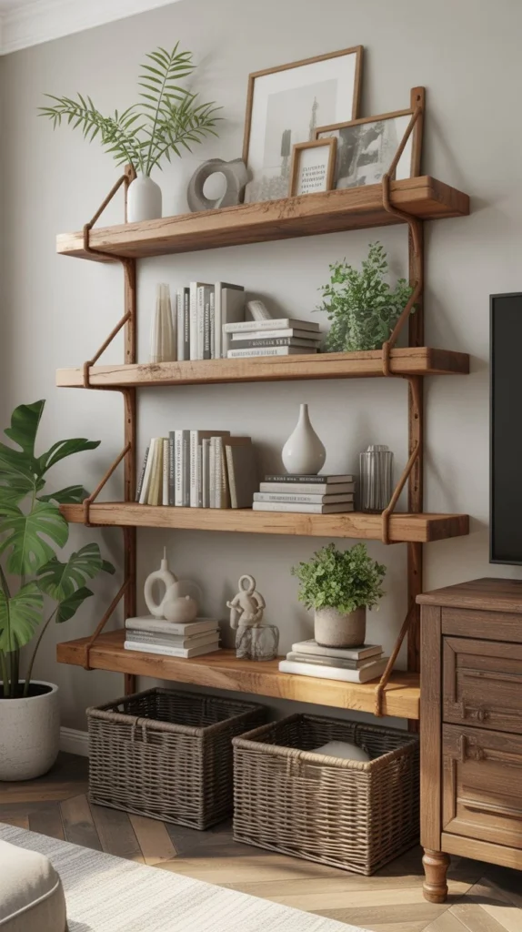 Style your shelves with a mix of functional and beautiful items: favorite books, vintage finds, framed photos, plants, and pretty storage baskets. Follow the rule of thirds—group items in odd numbers for visual appeal. Leave some breathing room; overcrowded shelves lose their impact.