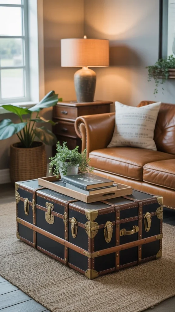 Repurpose an old steamer trunk or vintage chest as a unique coffee table with built-in storage. These pieces add character while providing a place to stash blankets, games, or off-season decor. Stack two trunks of different sizes for added height and interest.