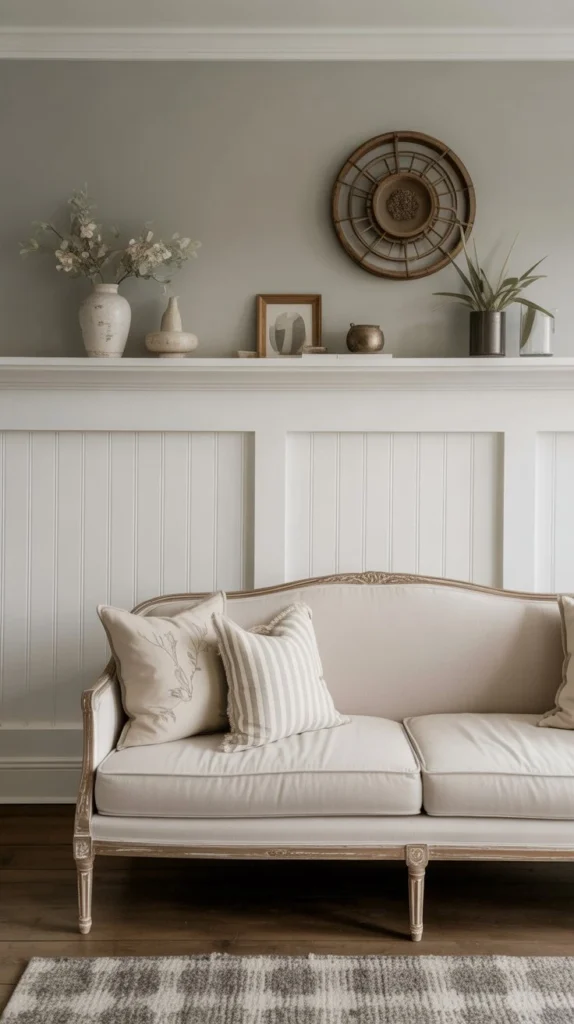 Board-and-batten wainscoting is particularly farmhouse-friendly and relatively DIY-friendly for those who own their homes. For renters, paintable textured wallpaper or peel-and-stick beadboard can create a similar effect without permanent installation.
