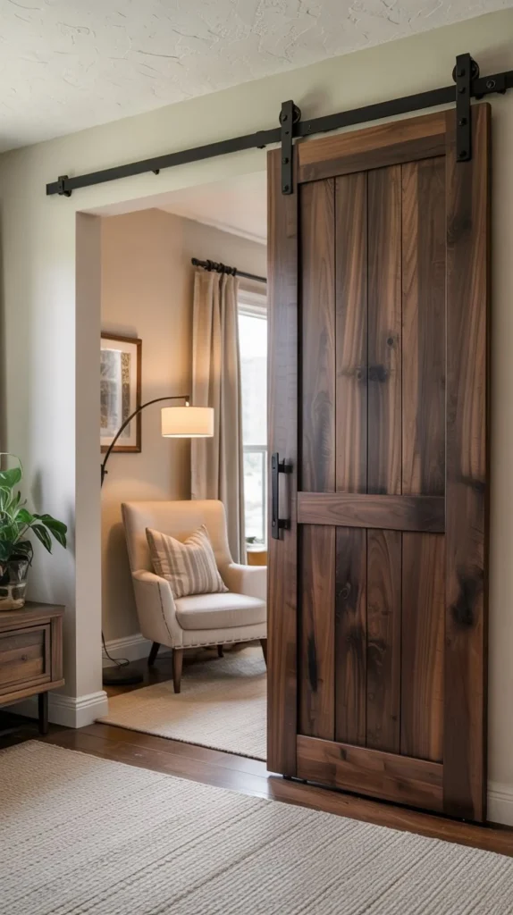 The hardware itself becomes part of the decor—think matte black metal tracks and chunky rollers. You can find barn door kits at most home improvement stores, and many come ready to install. Choose reclaimed wood for authentic character, or paint a new door in a soft sage or barn red for a pop of color.