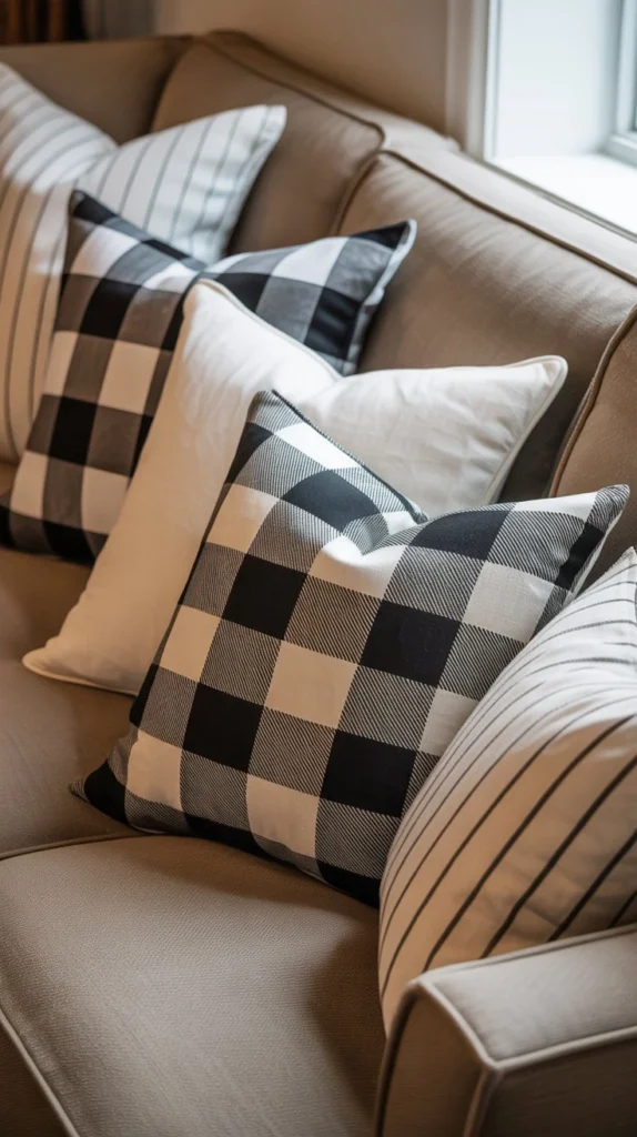 Mix patterns thoughtfully by varying the scale—pair large buffalo check with smaller ticking stripes. Stick to a cohesive color story, typically blacks, whites, grays, and natural tones. Use patterned items as accents rather than the main attraction.