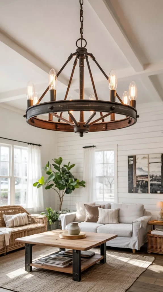 Swap out builder-grade light fixtures for vintage-style pieces that make a statement. Think wrought iron chandeliers, metal cage pendants, or glass-and-wood combinations. These fixtures combine industrial and rustic elements that perfectly capture the farmhouse aesthetic.