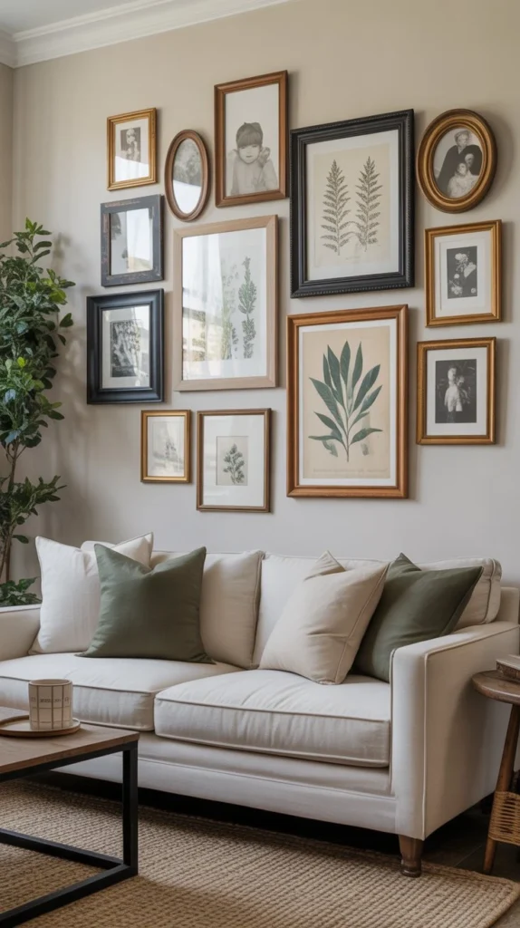 Include unexpected elements like vintage windows, small mirrors, or antique signs alongside your photos. This eclectic approach adds personality and makes your living room feel uniquely yours. Start by laying out your arrangement on the floor before hammering any nails.